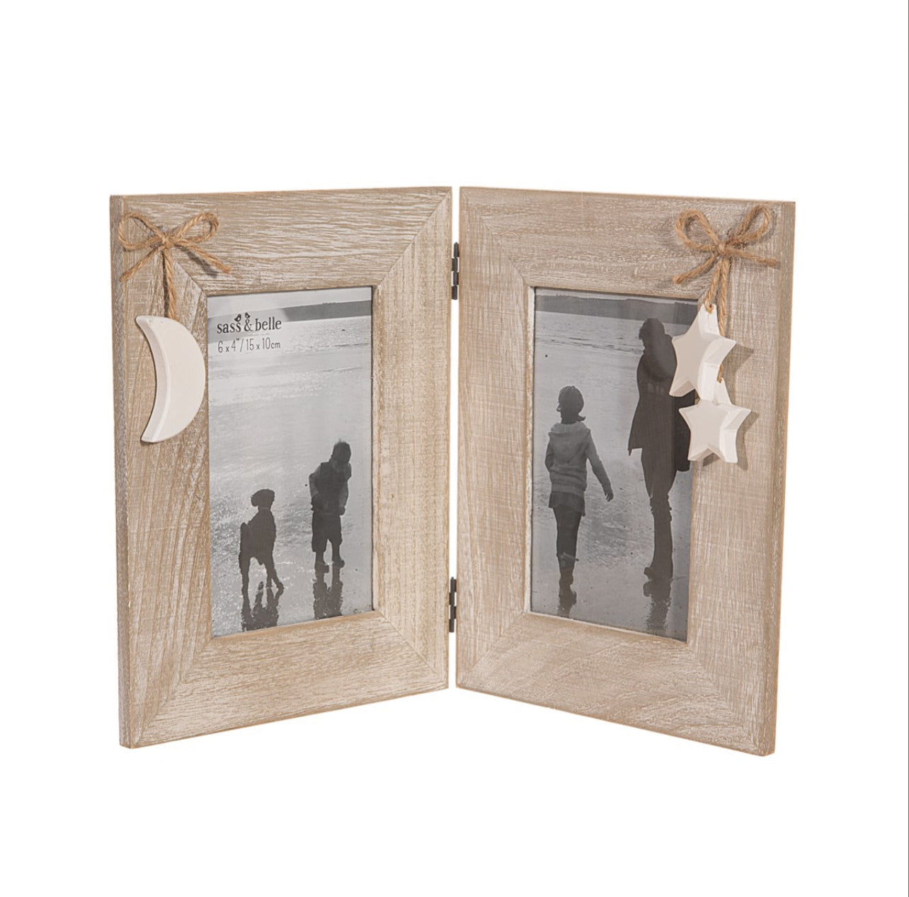 Deze dubbele houten fotokader koestert en kadert elke mooie herinnering. Liefde tot de maan en terug en nog ver daarbuiten.