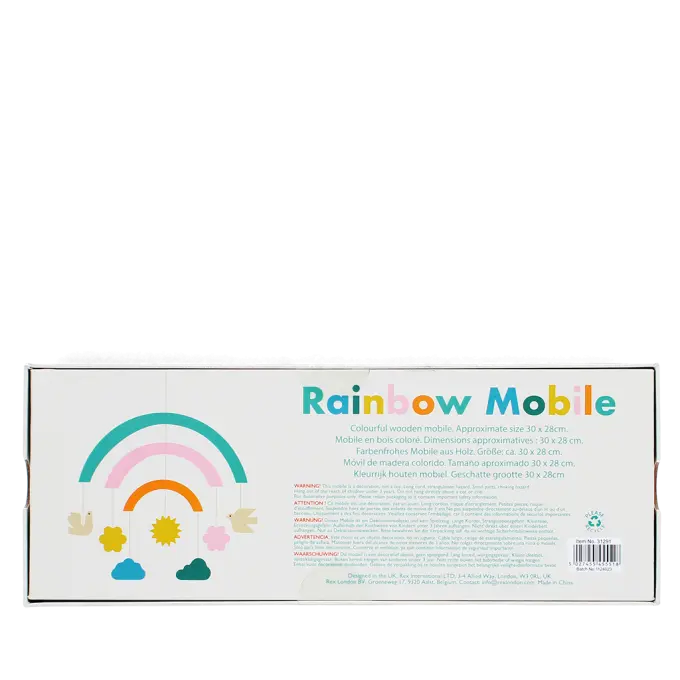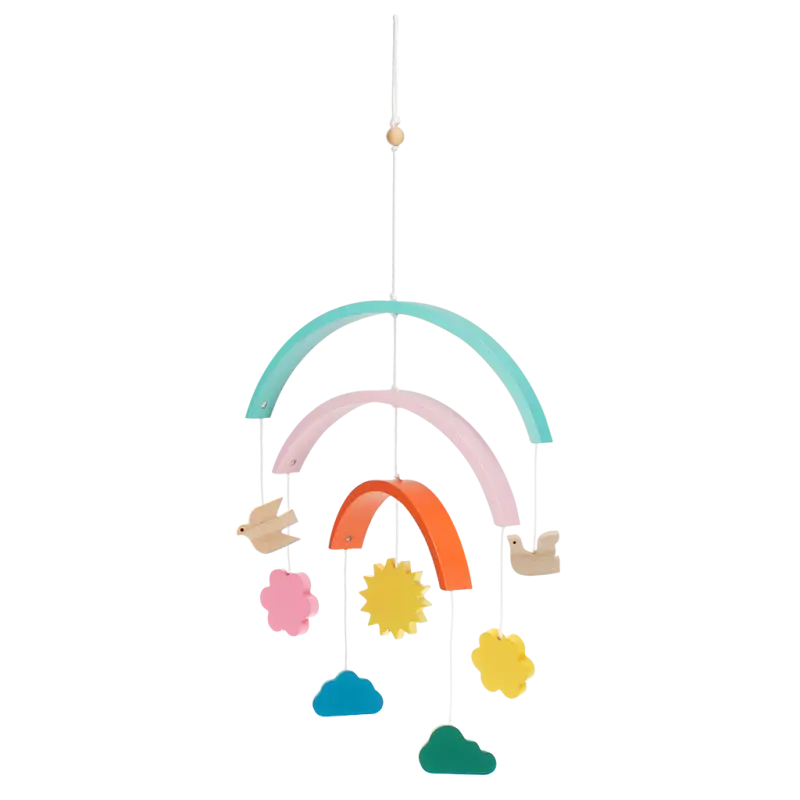 Deze houten regenboog mobiel is een blikvanger in iedere kinderkamer en bevordert bovendien de visuele waarneming van een baby. Er is altijd iets nieuws te ontdekken! De leuke kleuren en figuurtjes zijn een uitnodiging voor hemelse dromen.