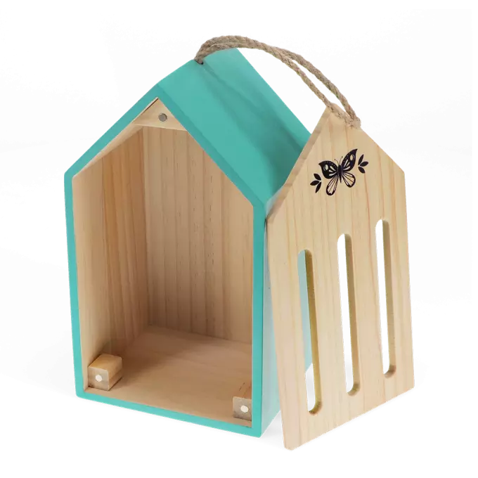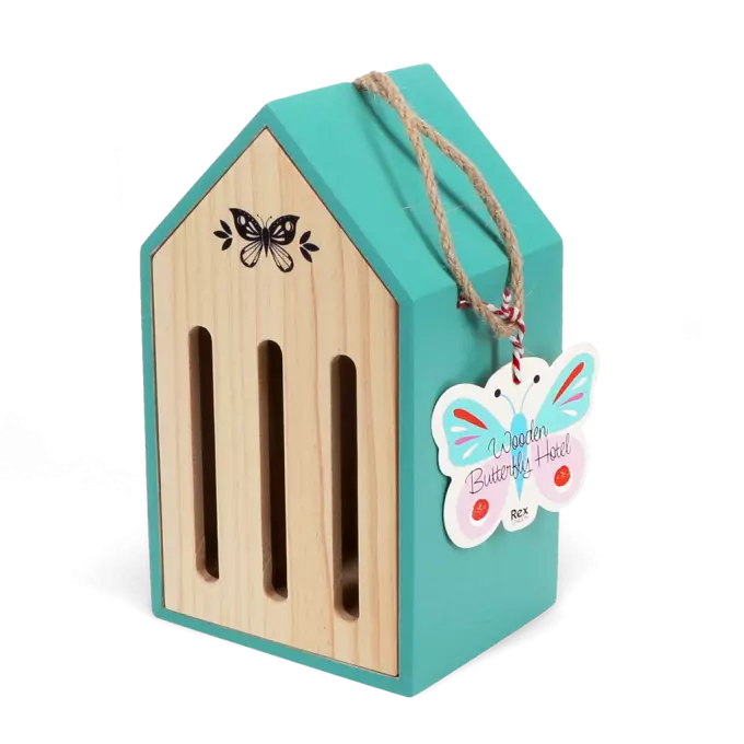 Verwelkom de meest prachtige vlinders in dit schattig houten vlinderhotel. Met zijn zachte pastelblauwe kleur staat het mooi in elke tuin of terras en zorgt het voor een welkome en veilige rustplek voor deze bijzondere diertjes.